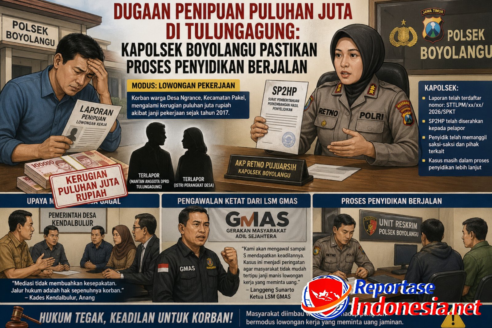 TULUNGAGUNG,Reportaseindonesia.net– Aparat kepolisian memastikan proses hukum atas dugaan kasus penipuan bermodus lowongan pekerjaan yang melibatkan oknum mantan anggota DPRD Tulungagung dan istri perangkat desa kini tengah bergulir. Kapolsek Boyolangu menegaskan bahwa pihak penyidik sedang mendalami laporan tersebut untuk memberikan kepastian hukum bagi korban.