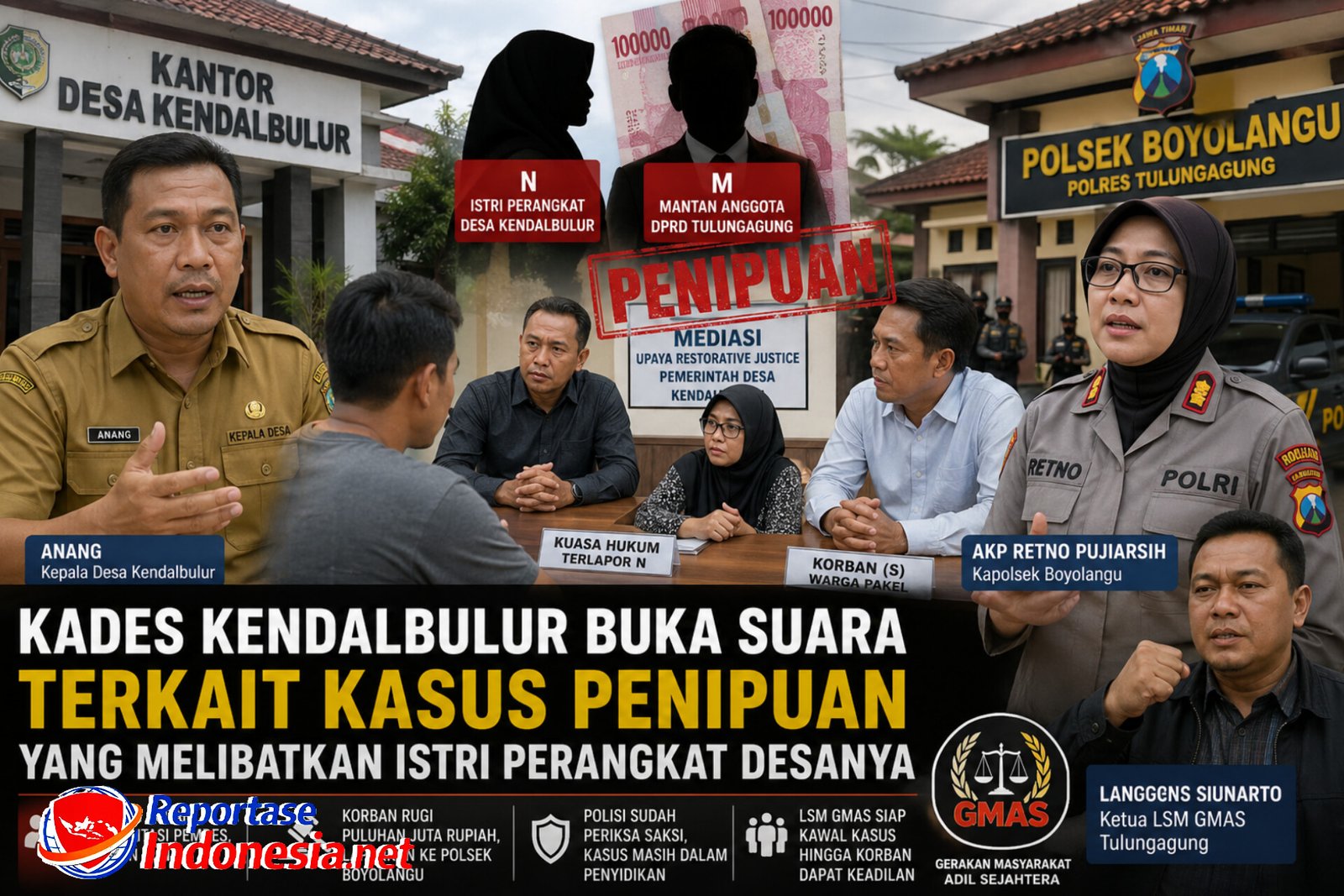 TULUNGAGUNG,Reportaseindonesia.net– Kepala Desa (Kades) Kendalbulur, Anang Mustofa, akhirnya buka suara terkait terseretnya nama salah satu istri perangkat desanya dalam dugaan kasus penipuan lowongan pekerjaan pada Selasa, (28/4/2026). Pemerintah Desa (Pemdes) Kendalbulur mengaku telah berupaya maksimal memfasilitasi mediasi sebelum kasus tersebut akhirnya resmi dilaporkan ke Polsek Boyolangu.