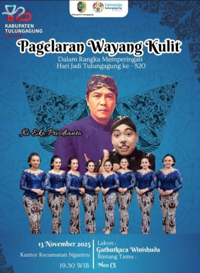 Tulungagung,Reportaseindonesia.net-Peringatan Hari Jadi ke-820 Kabupaten Tulungagung dimeriahkan dengan pagelaran budaya adiluhung, yakni pertunjukan wayang kulit semalam suntuk di halaman Pendopo Kecamatan Ngantru pada, Kamis, (13/11/2025). Ribuan warga dari berbagai penjuru tumpah ruah di lokasi untuk menyaksikan pertunjukan warisan budaya yang diakui Unesco ini.