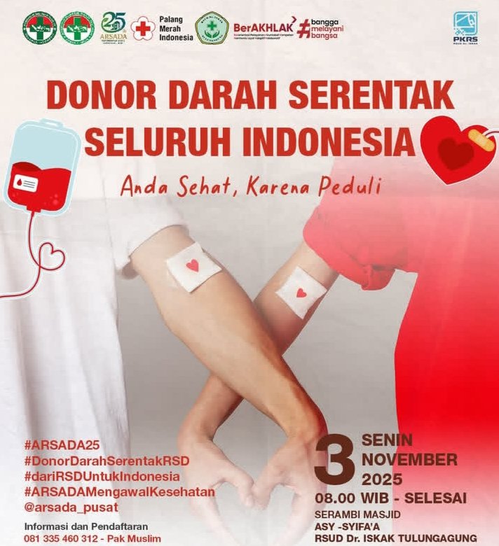 Tulungagung,Reportaseindonesia.net-RSUD Dr. Iskak Tulungagung ikut serta dalam kegiatan donor darah serentak yang diselenggarakan oleh Asosiasi Rumah Sakit Daerah Seluruh Indonesia (ARSADA) dalam rangka memperingati Hari Ulang Tahun ke-25. Kegiatan ini juga bertujuan untuk mencatatkan Rekor MURI dengan kategori “Kegiatan Donor Darah Serentak oleh Rumah Sakit Daerah Terbanyak di Seluruh Indonesia”.